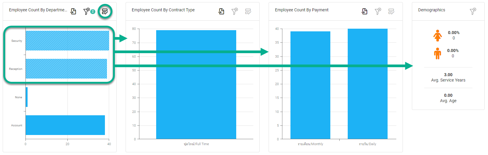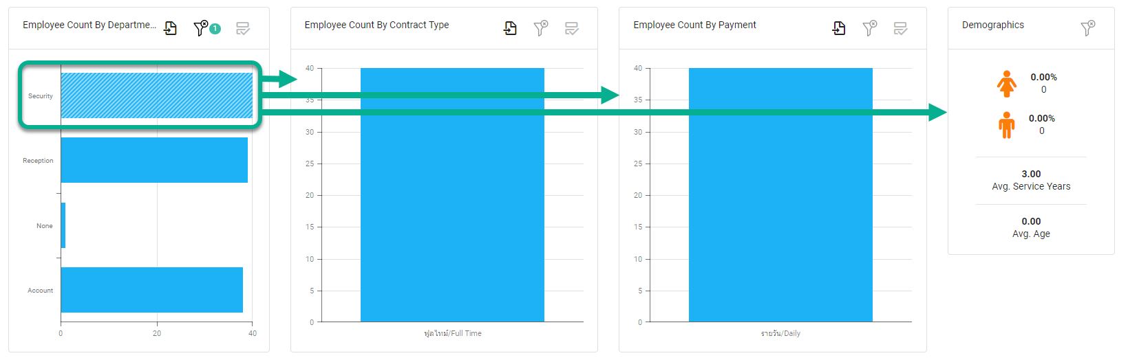 Dashboard เป็นสรุปข้อมูลต่างๆ ให้มาแสดงอยู่ในหน้าเดียวกันในมุมมองต่างๆ เช่น กราฟ ตัวเลข เปอร์เซ็นต์ สี เป็นต้น เพื่อให้สามารถดูได้ง่าย รวมทั้งเพื่อเห็นการเปลี่ยนแปลงของข้อมูลตลอดเวลา ซึ่งสามารถใช้ข้อมูลจาก Dashboard มาประกอบการวางแผนกำลังคน วิเคราะห์งบประมาณค่าจ้าง ต่างๆ ได้