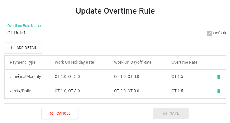 ระบบจะให้เลือกประเภทอัตราค่าล่วงเวลา (OT Type) ตามกฏค่าล่วงเวลา (OT Rules) ที่ตั้งเป็นค่าเริ่มต้นไว้