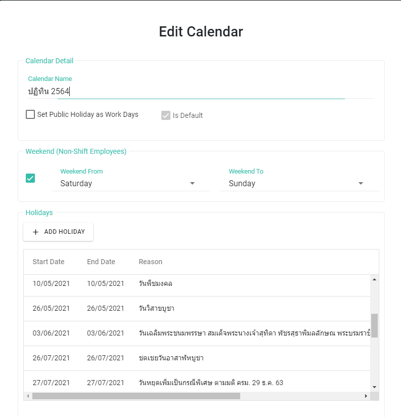 โดย พนักงานจะมี วันหยุดประจำสัปดาห์ (Day Off) และ วันหยุดนักขัตฤกษ์ (Holiday) ตามปฏิทิน (Calendar) ที่ตั้งเป็นค่าเริ่มต้นไว้