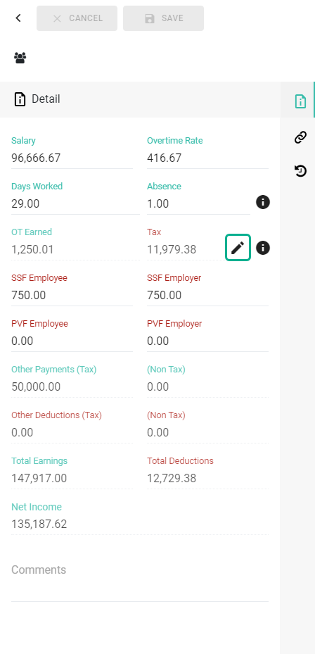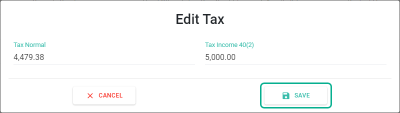 วิธีการแก้ไขภาษีของเงินได้มาตรา 40(2) (Edit Tax for Income 40(2))ในกรณีที่พนักงานได้รับทั้งเงินได้ตามมาตรา 40(1) และมาตรา 40(2) ระบบจะแสดงภาษีเป็นยอดรวมของภาษีจากเงินได้ปกติคือเงินได้ตามมาตรา 40(1) และเงินได้ตามมาตรา 40(2) รวมกัน แต่อย่างไรก็ดีเราสามารถกดดูภาษีของเงินได้แต่ละมาตราได้ รวมถึงสามารถแก้ไขภาษีของเงินได้แต่ละมาตราได้ดังนี้