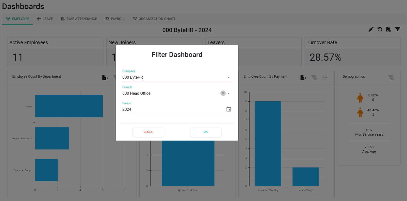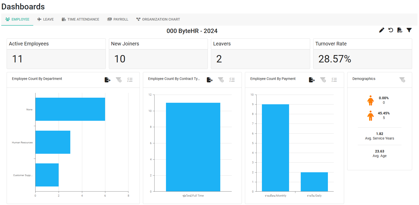 Dashboard พนักงาน เป็น Dashboard ที่แสดงจำนวนพนักงานต่างๆ รวมถึงอัตราการลาออกของพนักงาน เป็นต้น