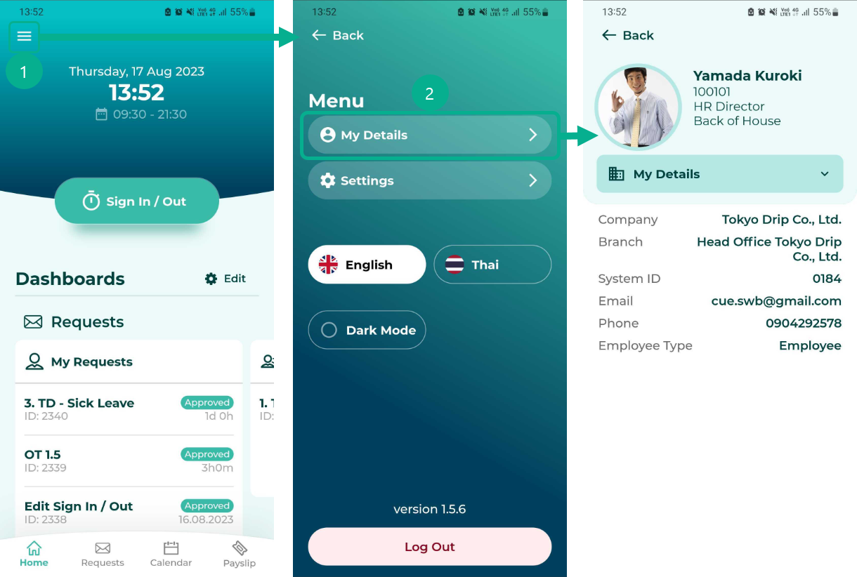 1. คลิกที่ เมนู (Menu) และคลิก รายละเอียดของฉัน (My Details)