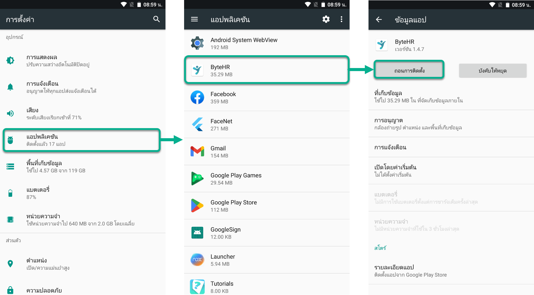 วิธีลบการติดตั้งแอป ByteHR (Uninstall ByteHR App) 1. เข้าไปที่หน้า การตั้งค่า (Setting) เลือก แอปพลิเคชั่น (Application) 2. เลือกแอปพลิเคชั่น ByteHR 3. เข้าไปที่แอพแล้วกด ถอนการติดตั้ง