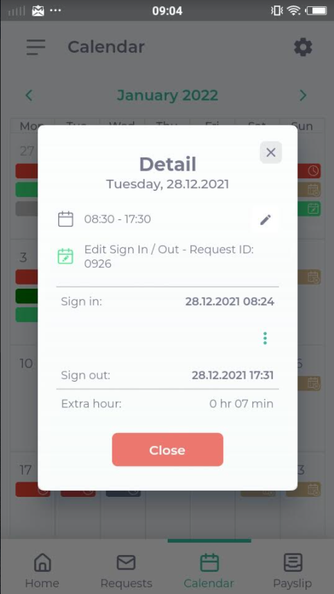 1.4) Employee Calendar Details show Regular Hours / Extra Hours / OT Hours in Employee Calendar Details (รายละเอียดปฏิทินพนักงานแสดงจำนวนชั่วโมงทำงานปกติ / จำนวนชั่วโมงเกินเวลาทำงานปกติ / จำนวนชั่วโมงโอที)