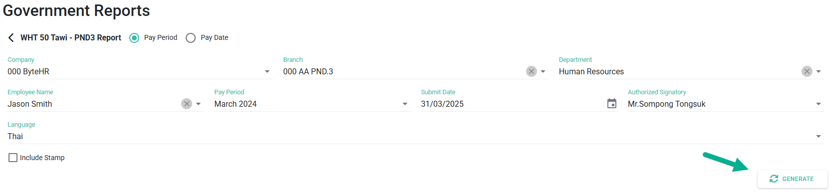 7. สามารถเลือกระยะเวลาการดึงรายงานได้ 2 แบบ (Pay Period) หรือ (Pay Date)