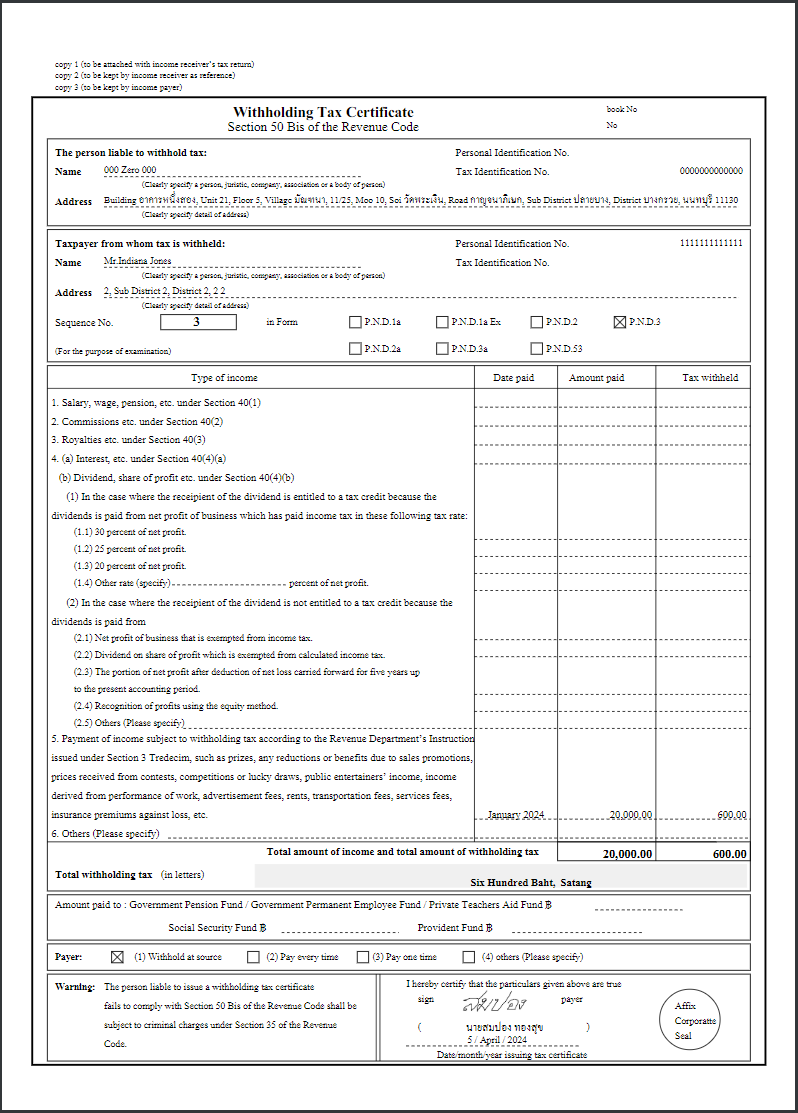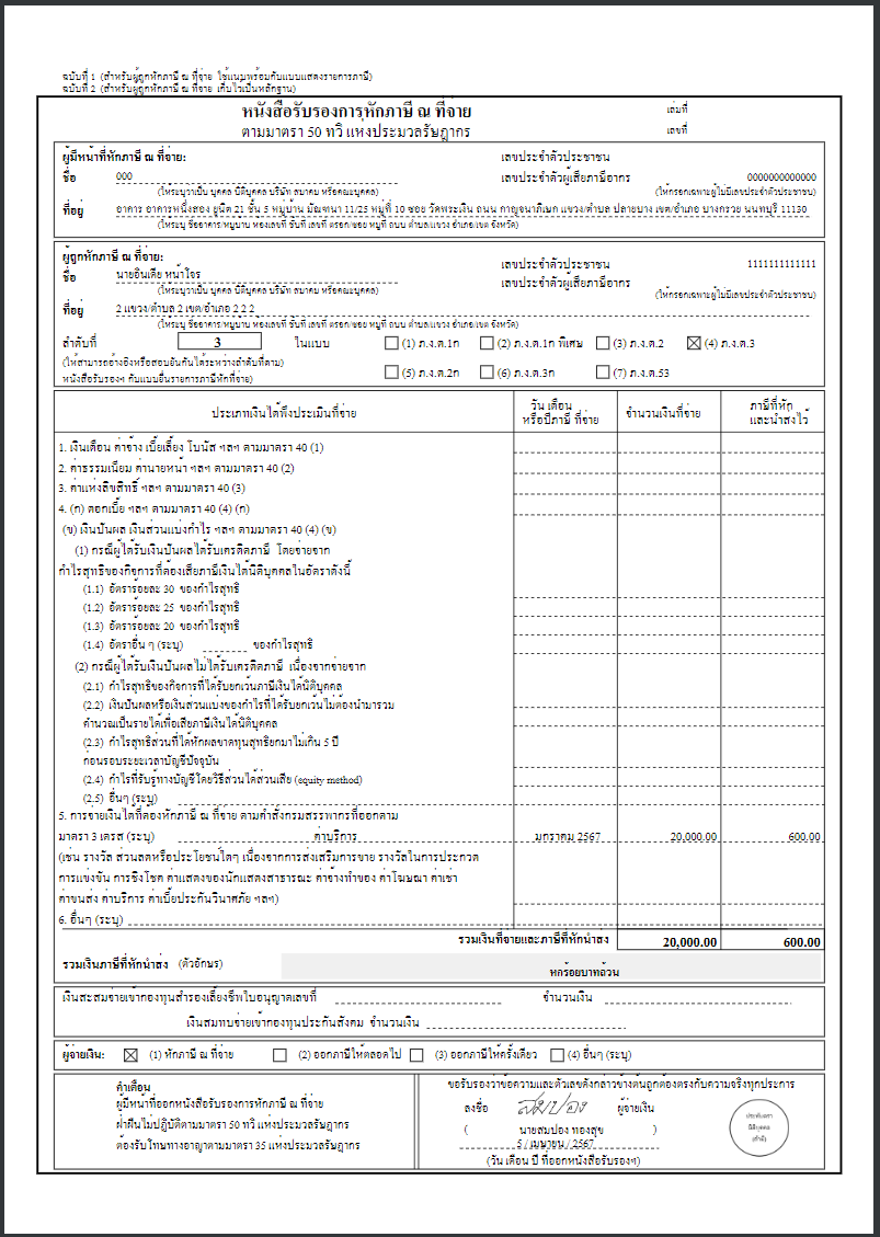 ตัวอย่าง หนังสือรับรองการหักภาษี ณ ที่จ่าย (ใบ 50 ทวิ) - ภ.ง.ด. 3 ภาษาไทย