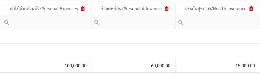 ระบบจะแสดงคอลัมน์ชื่อรายการ เงินได้อื่นๆ เงืนหักอื่นๆ และค่าลดหย่อนภาษี ดูได้จากสัญลักษณ์สีแดงและสีเขียวที่กำกับอยู่ที่ชื่อคอลัมน์
