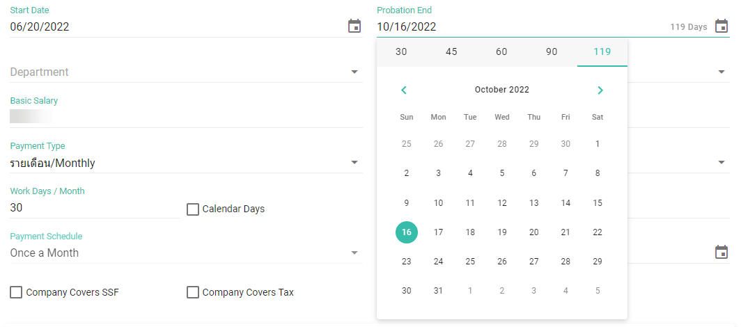 ○ คุณสามารถเลือกระยะเวลาของการทดลองงาน (30 / 45 / 60 / 90 / 119 วัน) ในสัญญาจ้างของพนักงาน ระบบจะคำนวณวันที่สิ้นสุดการทดลองงานให้อัตโนมัติ