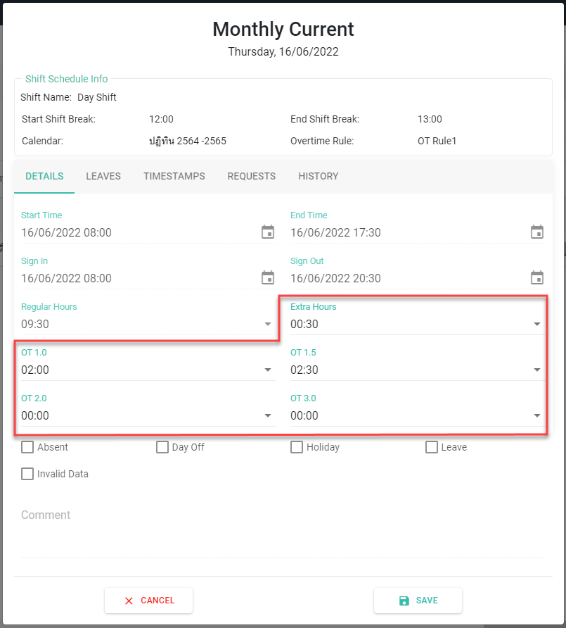 ○ ในกรณีที่ช่วงวันวัดรอบของเงินเดือน และ ค่าล่วงเวลา ไม่ตรงกัน คุณสามารถอนุมัติคำร้องค่าล่วงเวลา แก้ไขชั่วโมงโอที และ จำนวนชั่วโมงเกินเวลาทำงานปกติ ในตารางเวลาในช่วงเวลาที่อนุมัติเงินเดือนไปแล้วแต่ยังไม่ได้อนุมัติค่าล่วงเวลาในตารางเวลาได้ โดยระบบจะปิดการแก้ไขยกเว้นฟิล์ดที่เกี่ยวกับการทำงานล่วงเวลา