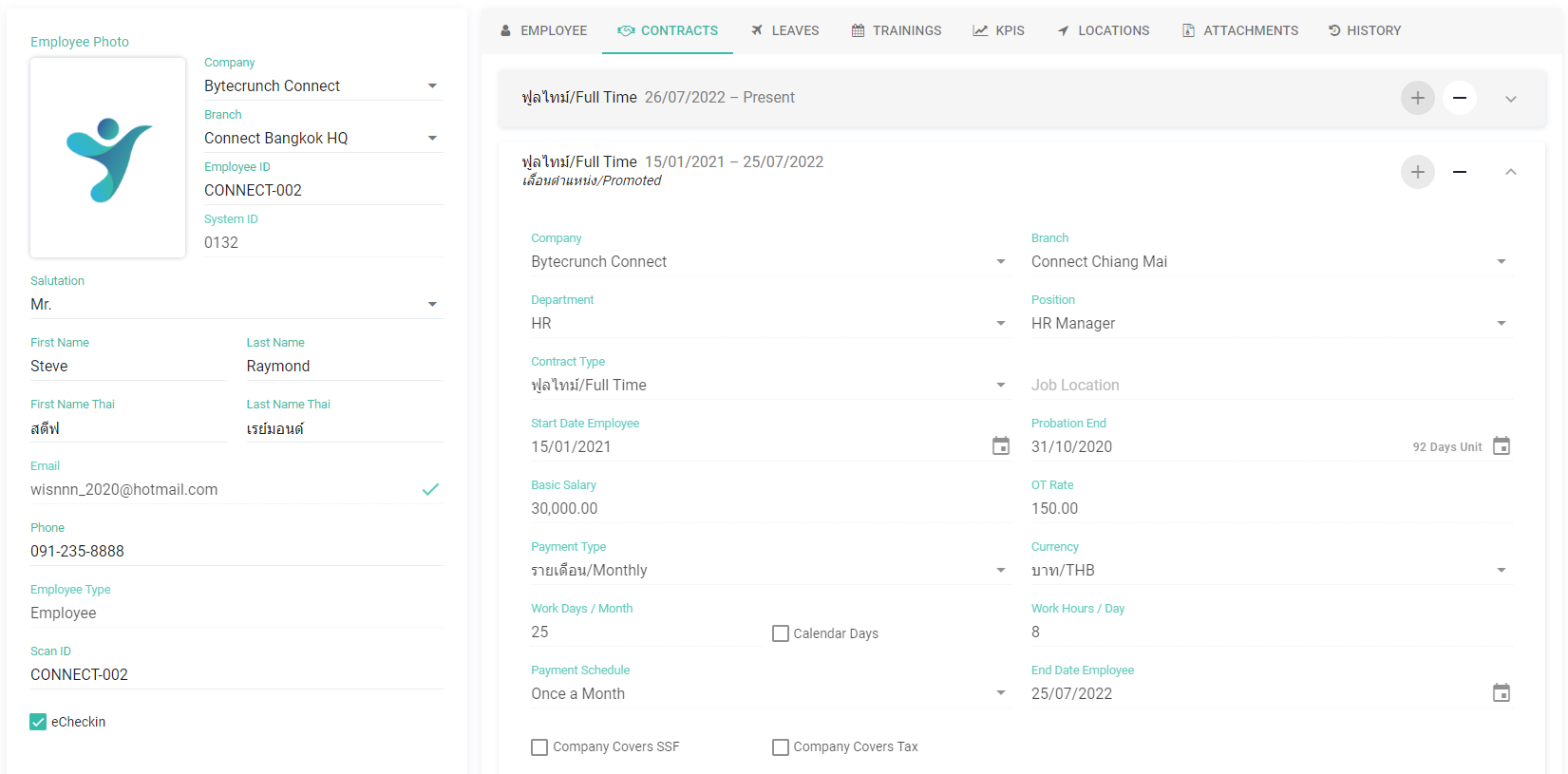 ○ เมื่อมีการปิดสัญญาจ้าง ByteHR จะบันทึกบริษัทและสาขา ของสัญญาจ้าง ณ เวลาที่ปิดสัญญาจ้างไว้ เพื่อให้คุณสามารถย้อนดูสัญญาจ้างเก่าของพนักงานได้