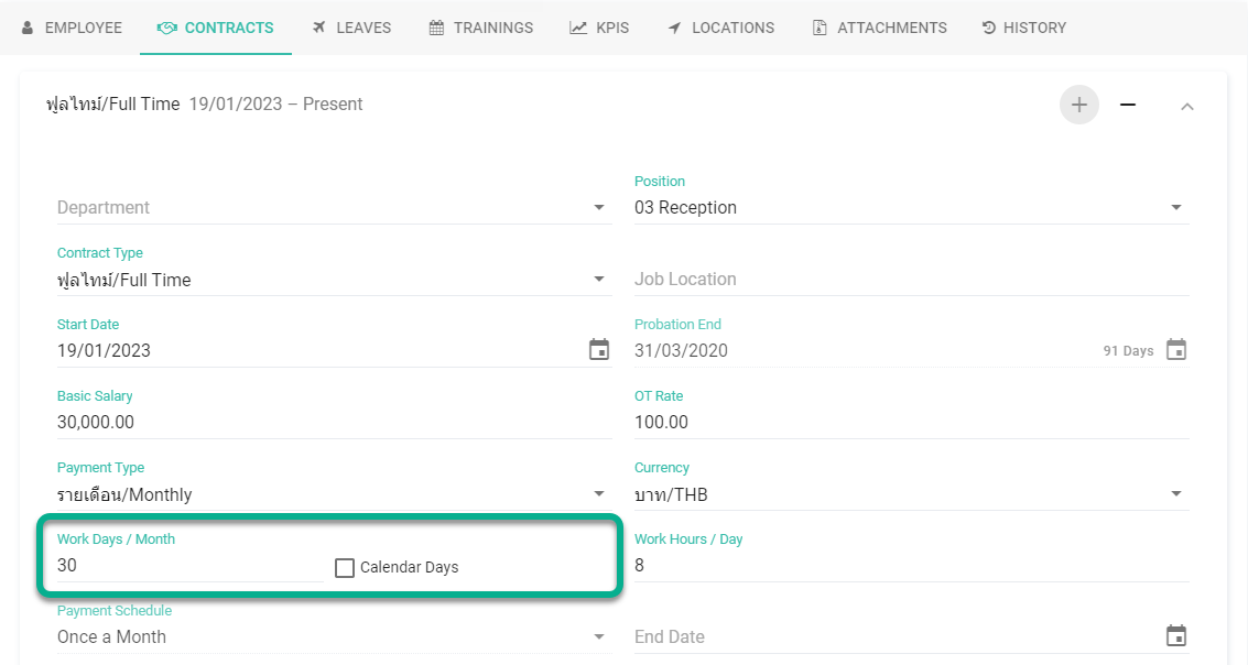 หากต้องการเปลี่ยนจำนวนวันทำงานต่อเดือนสามารถทำได้ 2 วิธีคือ 1. เปลี่ยนในสัญญาจ้างพนักงาน (Employee Contract) คลิกเมนู พนักงาน (Employees) -> คลิกพนักงานที่ต้องการแก้ไข -> แถบ สัญญาจ้าง (Contracts) -> แก้ไขที่ฟิล์ด จำนวนวันทำงานต่อเดือน (Work Days / Month) -> คลิก บันทึก (Save)