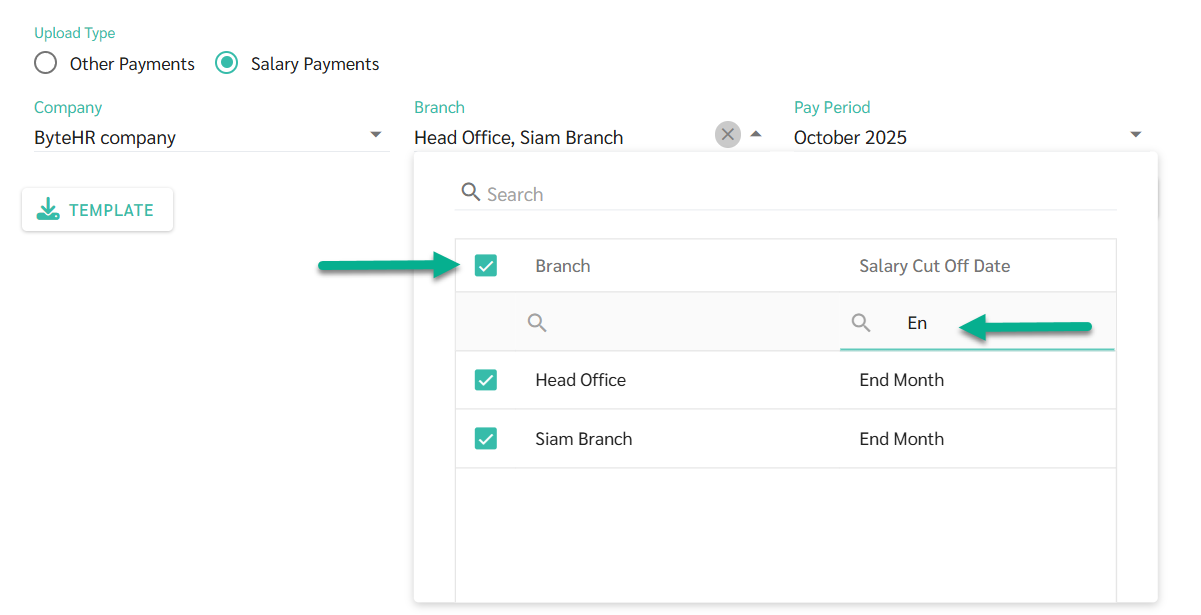 ○ สามารถเลือกหลายสาขาพร้อมกันได้ โดยที่แต่ละสาขาจะต้องมีวันตัดรอบเงินเดือน(Salary Cut Off Date) ตรงกัน