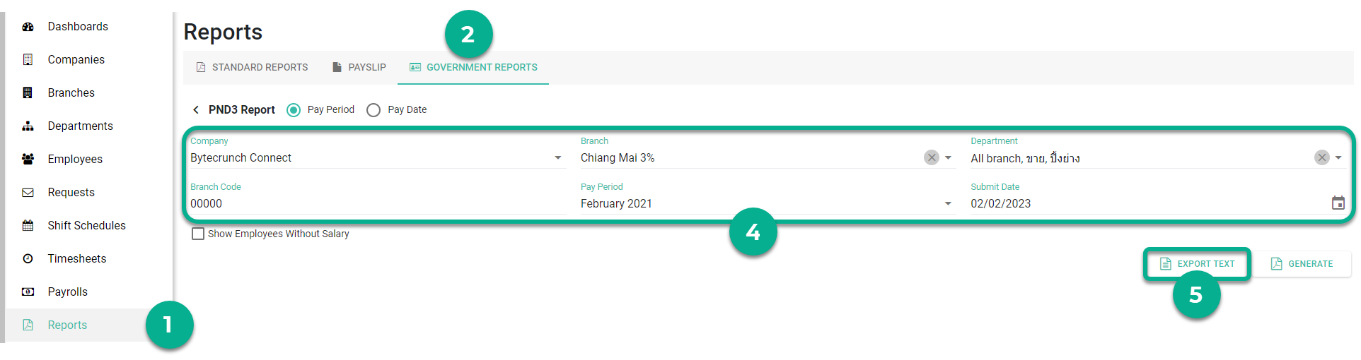 เลือก ระยะเวลาการชำระเงิน (Pay Period) และ ระบุวันที่ยื่น (Submit Date) - คลิก นำข้อความออก (Export Text)