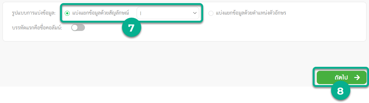 - เลือกรูปแบบการแบ่งข้อมูลเป็น แบ่งแยกข้อมูลด้วยสัญลักษณ์ | (ปุ่ม ฃ ฅ)