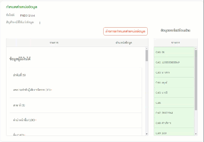 - คลิก และ ลากฟิล์ดจาก ข้อมูลจากไฟล์โอนย้าย (ด้านขวา) มาที่คอลัมน์ ตำแหน่งข้อมูล (ด้านซ้าย)