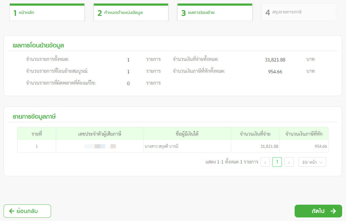 - ตรวจสอบความถูกต้องของข้อมูลการโอนย้ายให้จำนวนรายการที่โอนย้ายสมบูรณ์ จำนวนเงินที่จ่ายทั้งหมด และ จำนวนเงินภาษีที่หักทั้งหมด และคลิก ถัดไป