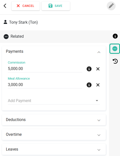 3. หากต้องการเพิ่มเงินได้ เงินหักอื่นๆ หรือ โอทีให้คลิกแถบ ที่เกี่ยวข้อง (Related) จากนั้นสามารถเพิ่มรายการได้ โดยการคลิกที่ Drop Down แล้วเลือกรายการที่ต้องการ และใส่จำนวนเงิน