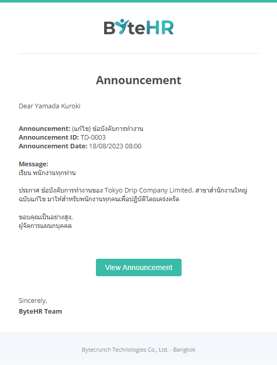 พนักงานจะได้รับอีเมลแจ้งเตือนเมื่อมีการออกประกาศ โดยจะเห็นข้อความประกาศ แต่หากประกาศมีไฟล์แนบ จะไม่สามารถดูไฟล์แนบประกาศจากทางอีเมลได้