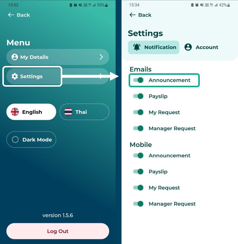 พนักงานจะได้รับอีเมลแจ้งเตือนกรณีที่เปิดการใช้งาน ประกาศ (Announcement) ใน การแจ้งเตือนทางอีเมล (Mail Notification) เท่านั้น