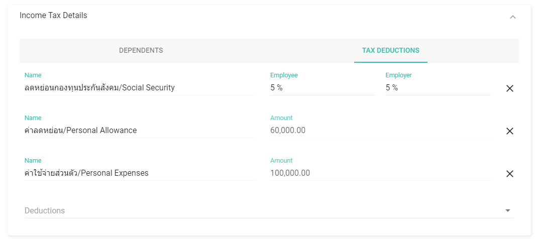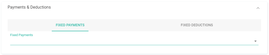 6. เพิ่ม เงินได้ประจำ และ เงินหักประจำ (Fixed Payments & Fixed Deductions) โดยการคลิกลูกศรลงเพื่อเลือก เงินได้ หรือ เงินหัก ที่แอดมินมีการสร้างไว้ในระบบแล้ว