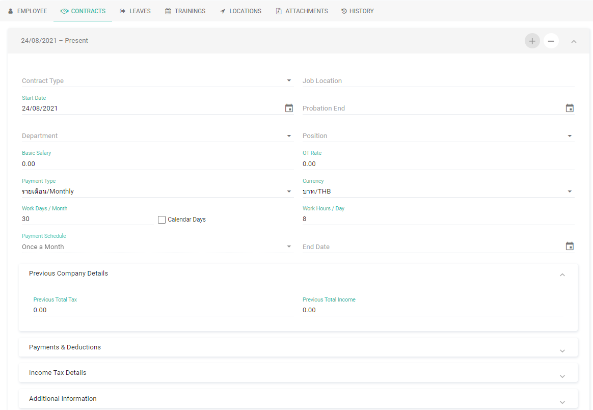 5. ใส่ข้อมูลต่างๆ ให้ครบถ้วน เช่น วันเริ่มงาน(Start Date) ตำแหน่งงาน(Position) ฐานเงินเดือน(Basic Salary) ประเภทเงินได้(Payment Type) เป็นต้น