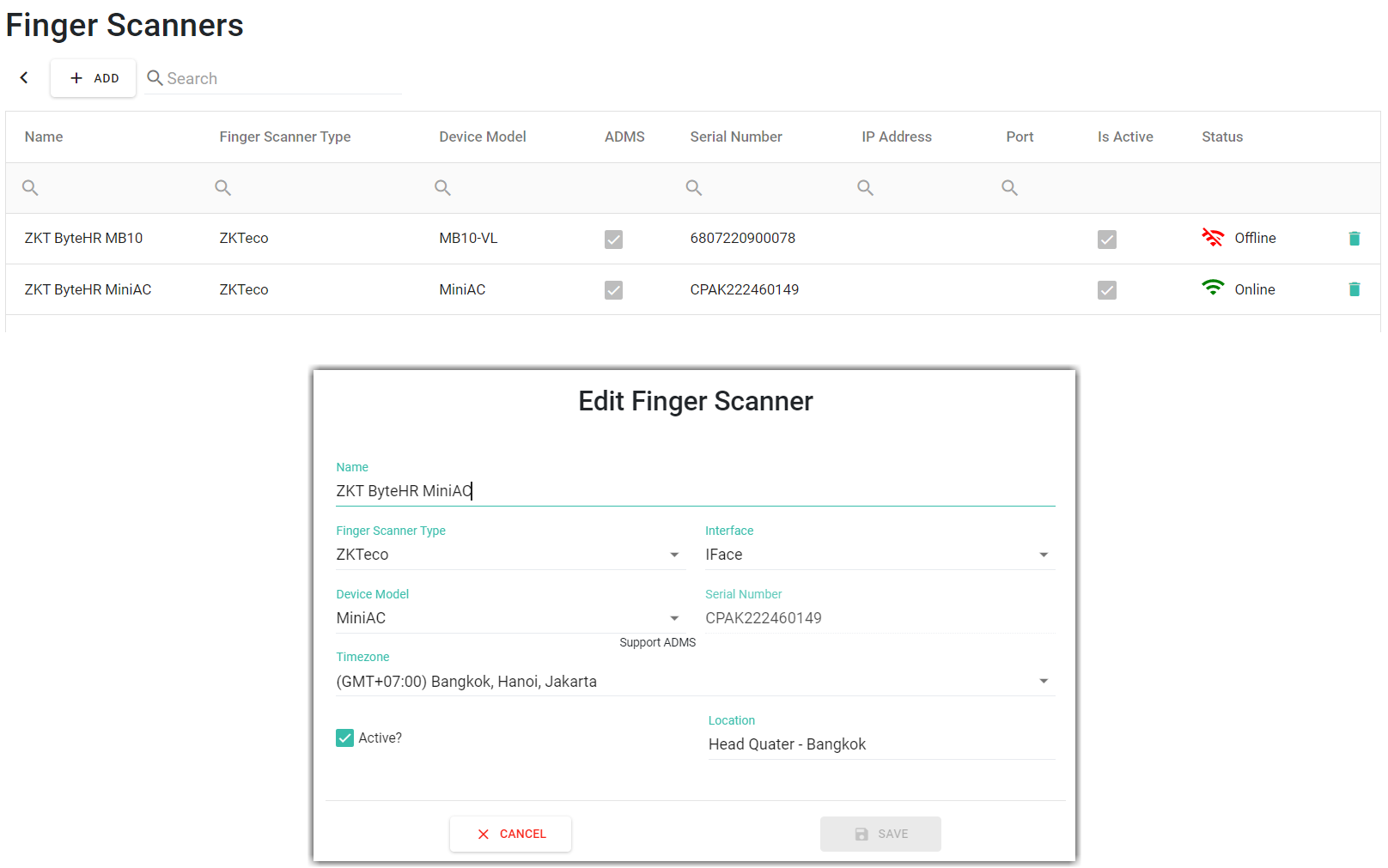 ท่านสามารถเชื่อมต่อข้อมูลการลงเวลาแบบเรียลไทม์จากเครื่องสแกนนิ้วที่รองรับการใช้งาน ADMS โดยตรงผ่านเว็บแอป โดยไม่ต้องโหลด Desktop App