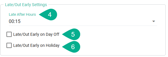 4. ในหัวข้อ ตั้งค่าการเข้างานสาย/ออกก่อน(Late/Out Early Settings) ช่อง ชั่วโมงเริ่มนับสาย (Late After Hours) แอดมินสามารถกำหนดจำนวน ชั่วโมงหรือนาที ที่จะให้ระบบเริ่มนับเวลาเข้างานสายได้