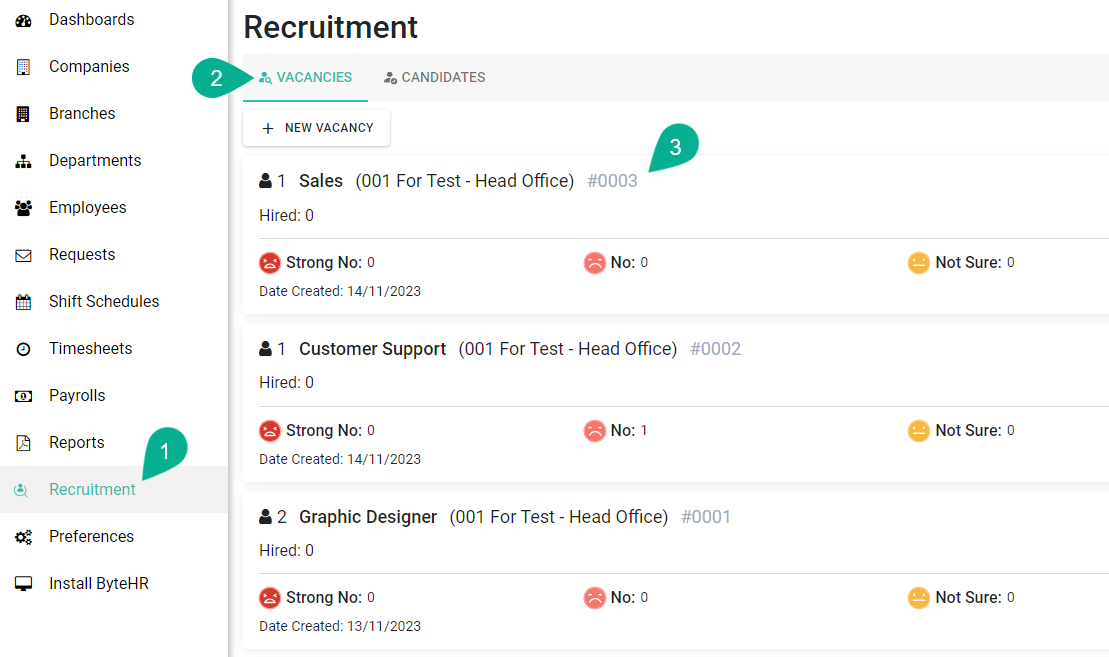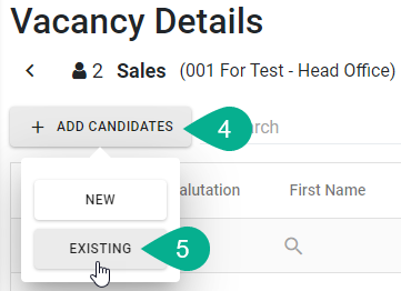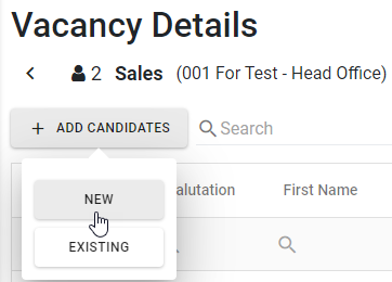 2. การสร้างข้อมูลจากแถบ Vacancies -> คลิกเลือกตำแหน่งว่างที่ต้องการ -> คลิก [+ Add Candidate] -> คลิก [New]