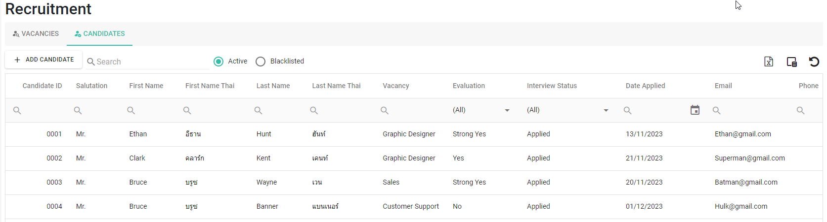 1. การสร้างข้อมูลจากแถบ Candidates คลิก [+ Add Candidate]