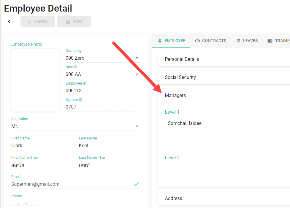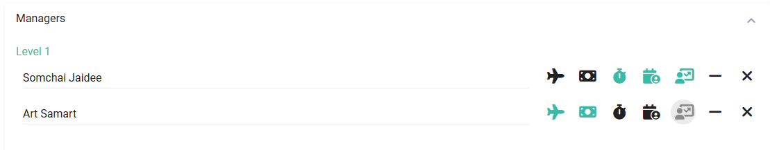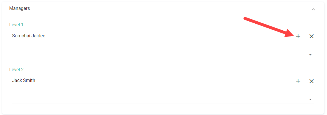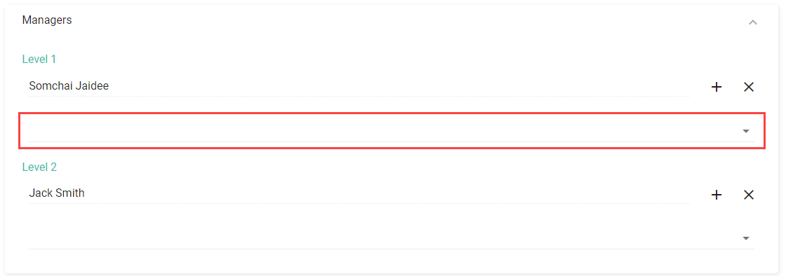 3. สามารถคลิก Dropdown ที่หัวข้อ ผู้จัดการระดับ 1 และ 2 เพื่อเลือกชื่อผู้จัดการที่ต้องการได้ โดยสามารถเพิ่มผู้จัดการได้ระดับละหลายคน