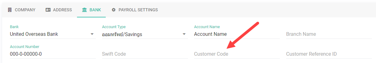 ขั้นตอนที่ 1 กรอกข้อมูลจำเป็น ○ สำหรับบริษัทที่ใช้ธนาคาร UOB ต้องกรอก รหัสลูกค้า(Customer Code) ที่เมนู บริษัท -> แถบ ธนาคาร