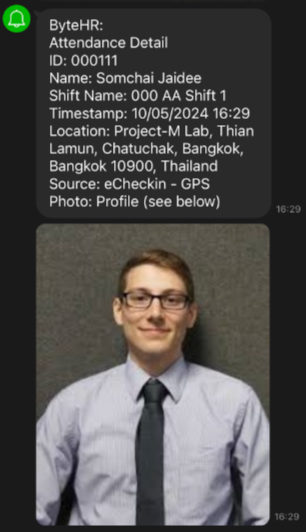 เมื่อมีการเปิดใช้งาน Line Notify ระบบจะแสดงรูปถ่ายของพนักงานเมื่อมีการลงเวลาทำงาน โดย