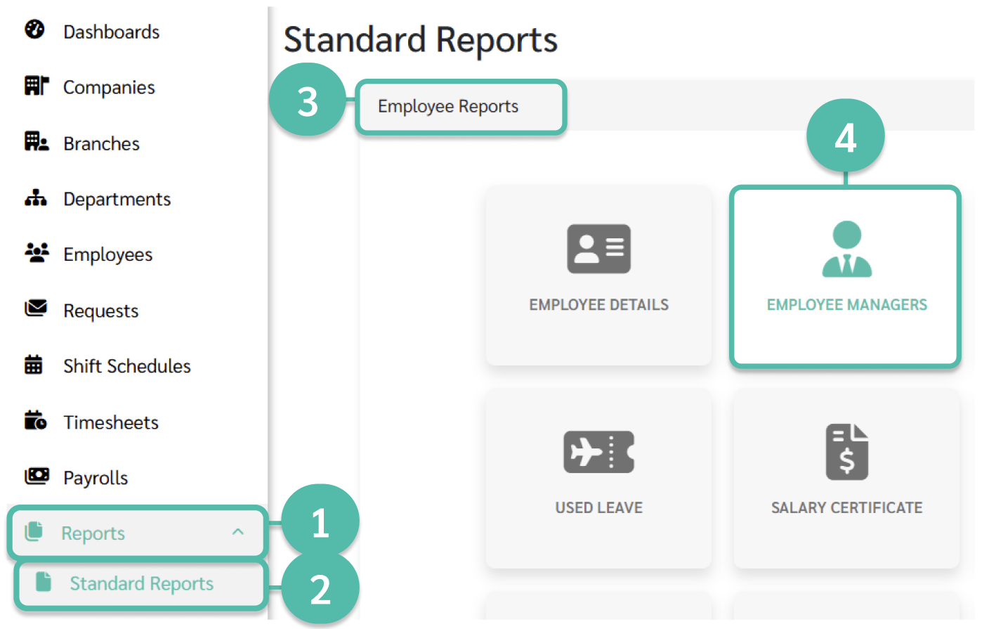 1. ที่เมนูรายงาน -> แถบ รายงานมาตรฐาน -> หัวข้อ รายงานเกี่ยวกับพนักงาน -> เลือกรายงาน ผู้จัดการพนักงาน (Employee Managers)
