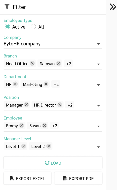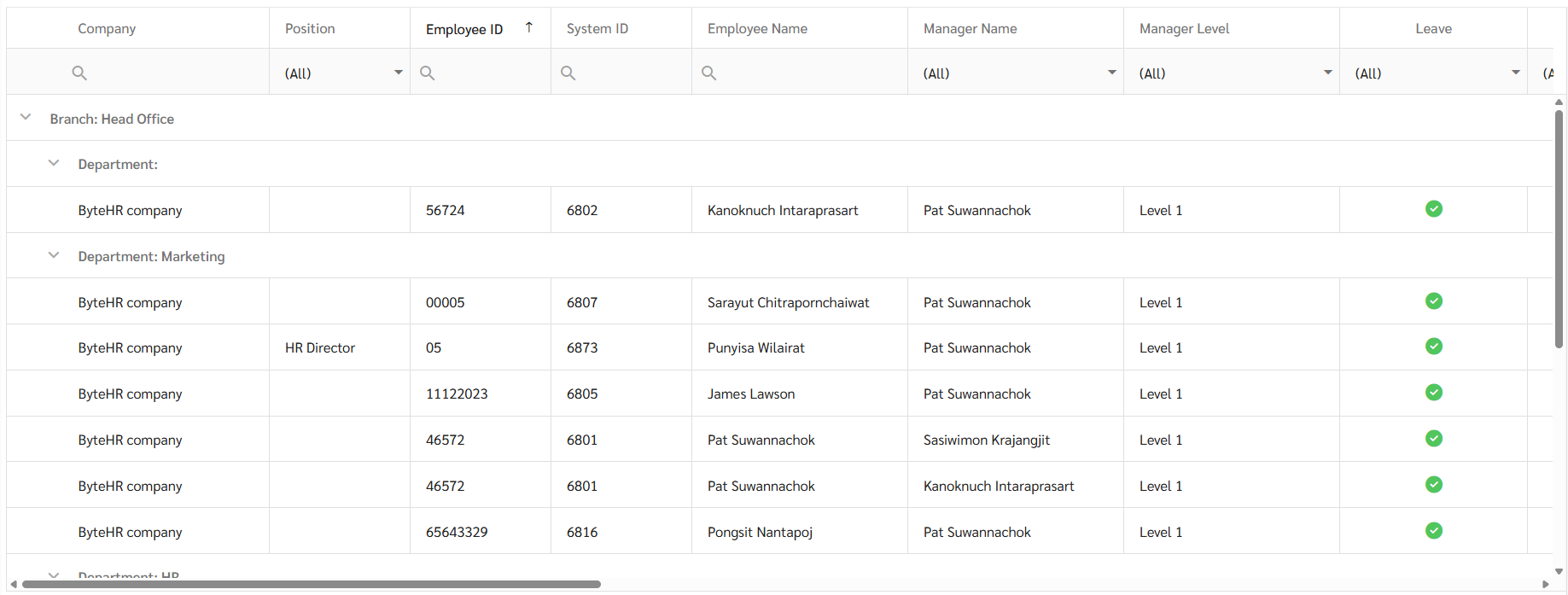 2. เลือก บริษัท (Company) สาขา (Branch) แผนก (Department) ตำแหน่ง (Position) พนักงาน (Employee) และ ระดับผู้จัดการ (Manager Level) ที่ต้องการตรวจสอบ