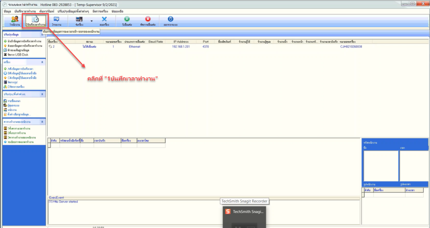 2. เมื่อเข้าโปรแกรม ZKT แล้ว ให้คลิกที่ "2บันทึกเวลาทำงาน" เพื่อดึงข้อมูลการลงเวลา
