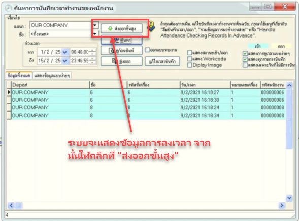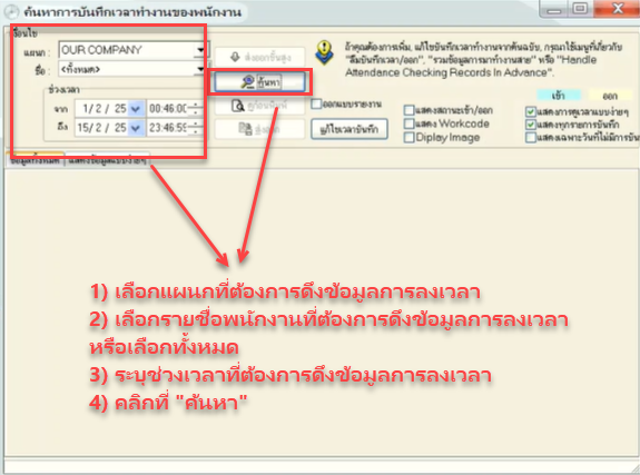 3. ระบุข้อมูลของแผนก, รายชื่อพนักงาน และช่วงเวลาที่ต้องการดึงข้อมูลการลงเวลา เสร็จแล้วคลิกที่ "ค้นหา"