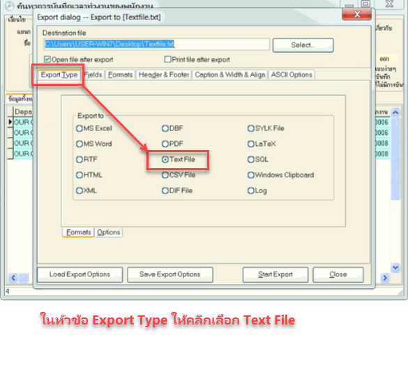 5. เลือกชนิดของไฟล์ที่ต้องการนำข้อมูลออกเป็น Text File โดยไปที่หัวข้อ "Export Type" และเลือก "Text File"