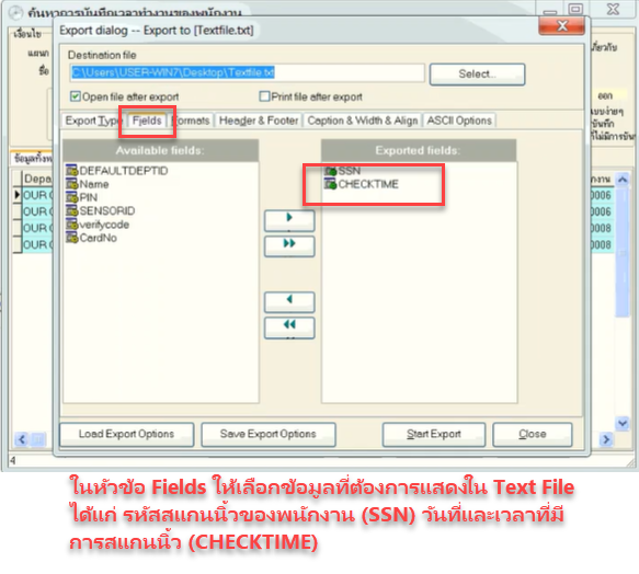 6. ระบุข้อมูลที่ต้องการให้แสดงใน Text File โดยไปที่หัวข้อ "Fields" และย้ายฟิลด์ "SSN" (รหัสสแกนนิ้วของพนักงาน) และ "CHECKTIME" (วันที่และเวลาที่มีการสแกนนิ้ว) จาก Available fields ไป Exported fields