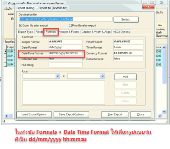 7. กำหนดรูปแบบวันที่และเวลาที่ต้องการให้แสดงใน Text File โดยไปที่หัวข้อ Formats และเลือกรูปแบบวันที่และเวลาเป็น dd/mm/yyyy hh:mm:ss