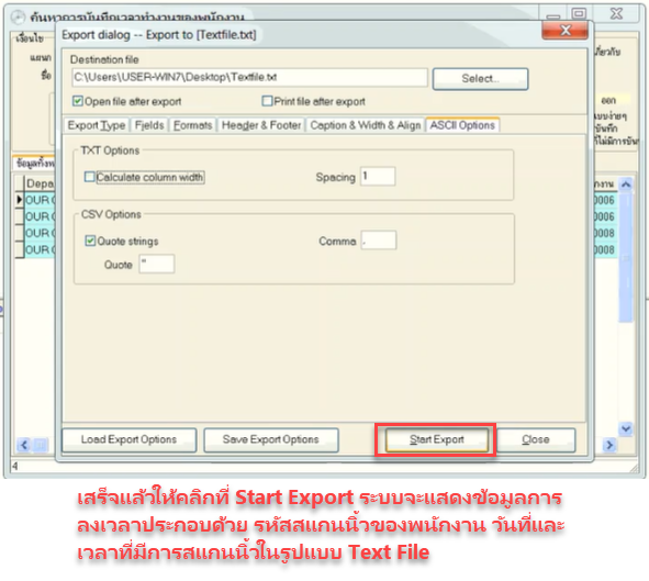 8. คลิกที่ Start Export ระบบจะแสดงข้อมูลออกมาเป็น Text File ให้บันทึก Text File นี้เพื่อใช้อัปโหลดในระบบ