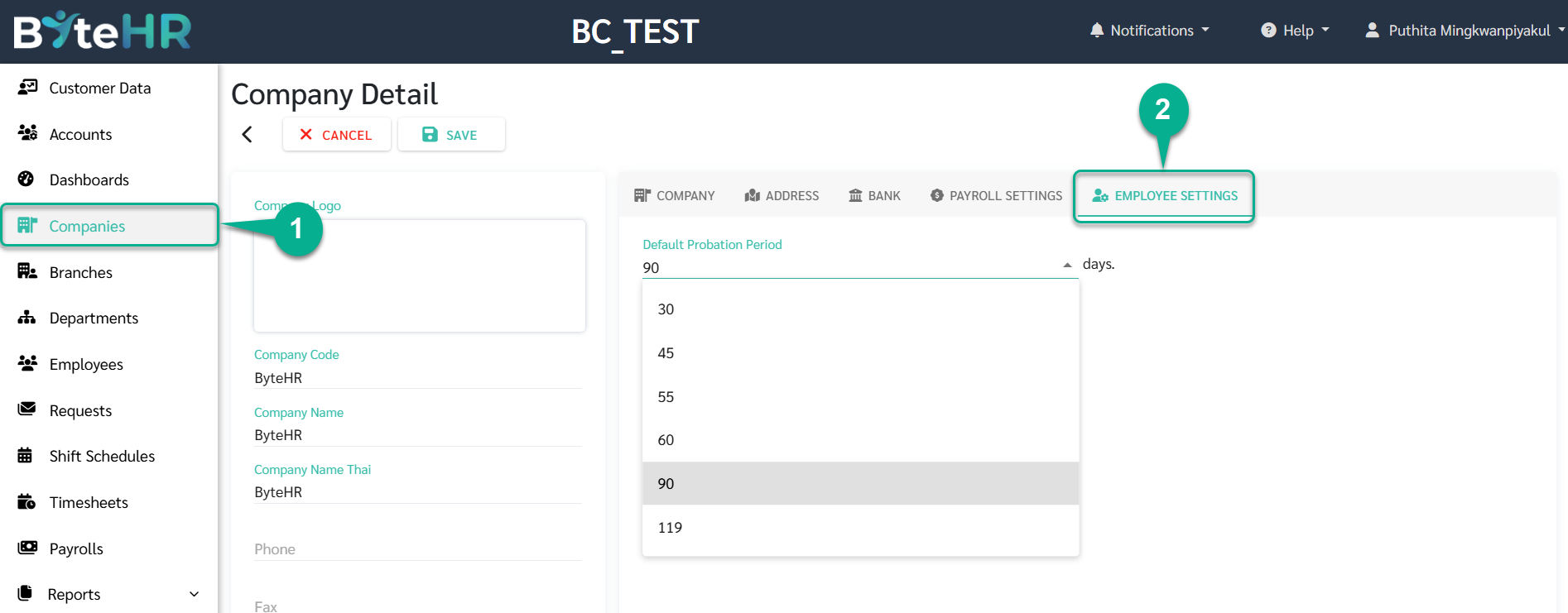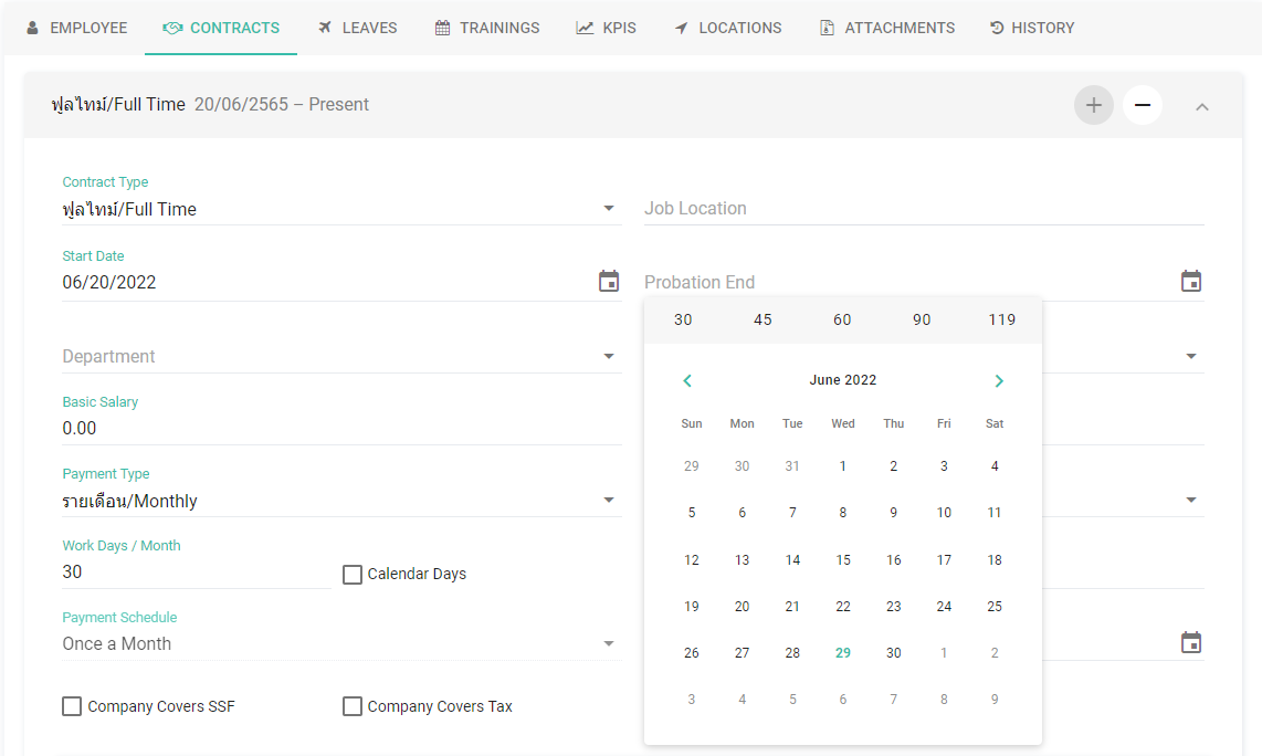 แอดมินสามารถกำหนด ระยะเวลาทดลองงานเริ่มต้น (Probation Period) ในระดับบริษัทได้ เพื่อให้การตั้งค่าข้อมูลพนักงานใหม่เป็นไปอย่างสม่ำเสมอ