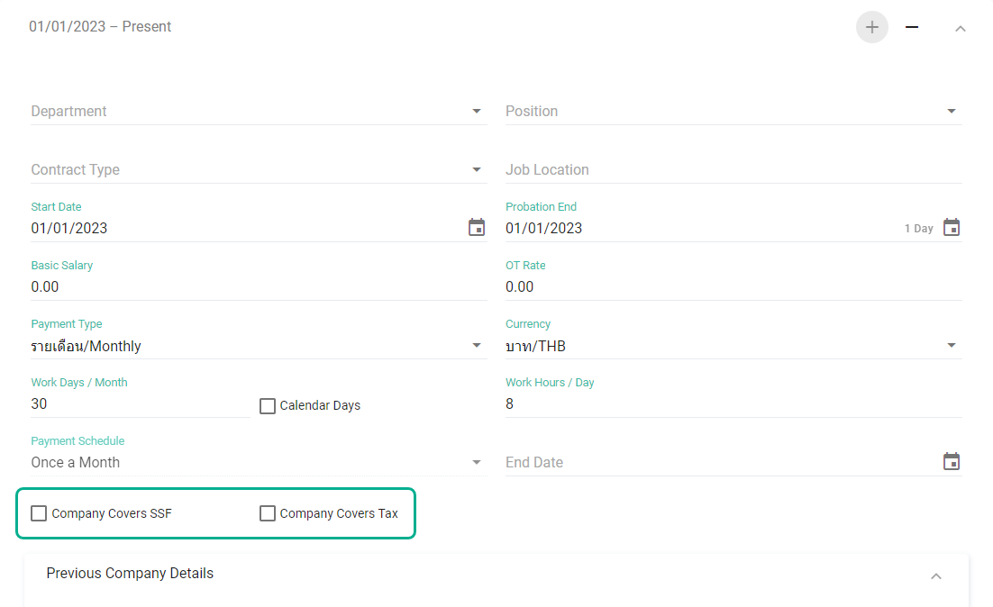 2. ติ๊กช่อง บริษัทออกประกันสังคมแทนให้ (Company Covers SSF) และ / หรือ บริษัทออกภาษีแทนให้ (Company Covers Tax) ในสัญญาจ้างของพนักงาน