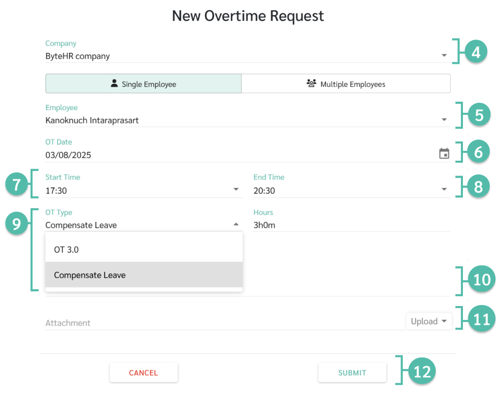 เวลาสิ้นสุด (End Time) = 20:00 ประเภทค่าล่วงเวลา (OT Type) = Compensate Leave |