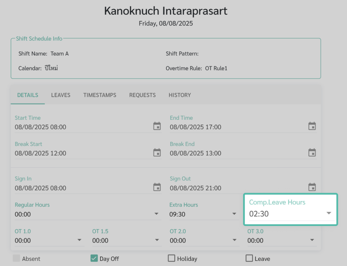 เมื่อมีการอนุมัติคำร้องขอโอที - ชดเชยวันลา ตารางเวลา (จะแสดงจำนวนชั่วโมงที่ได้รับอนุมัติในช่อง จำนวนชดเชยวันลา (Comp. Leave Hours)