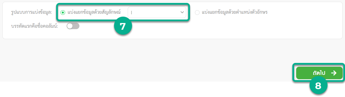 7. เลือกรูปแบบการแบ่งข้อมูลเป็น แบ่งแยกข้อมูลด้วยสัญลักษณ์ | (ปุ่ม ฃ ฅ)