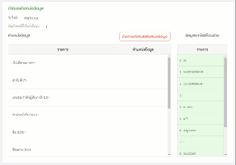 - คลิก และ ลากฟิล์ดจาก ข้อมูลจากไฟล์โอนย้าย (ด้านขวา) มาที่คอลัมน์ ตำแหน่งข้อมูล (ด้านซ้าย)