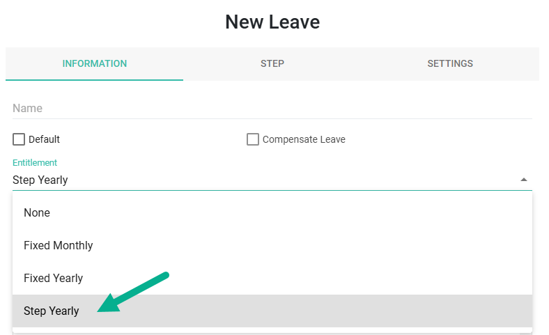 5. เลือกสิทธิการลา (Entitlement) ของจำนวนวันลาเป็น ขั้นตอน ต่อปี (Step Yearly)
