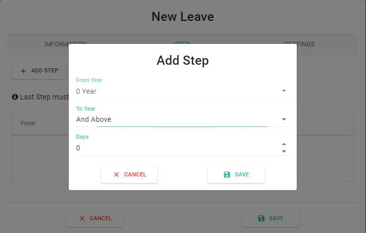 7. คลิก เพิ่มขั้นตอน(Add Step) จากนั้นระบุ ช่วงอายุงาน และ จำนวนสิทธิ์วันลา