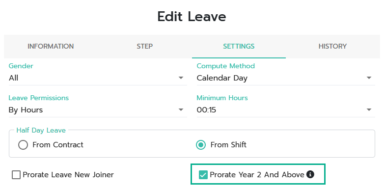 8. ที่แถบการตั้งค่า (Setting) สามารถติ๊กที่ตัวเลือก [เฉลี่ยวันลาตามสัดส่วนในปีที่ 2 ขึ้นไป(Prorate Year 2 And Above)] ในกรณีที่ต้องการให้ระบบเฉลี่ยวันลาตามสัดส่วนอายุงานในปีที่ 2 ขึ้นไป 1. ในกรณีที่ไม่ใช่การตั้งค่านี้ เมื่อถึงวันที่รีเซ็ตวันลา พนักงานจะได้รับจำนวนวันลาตามที่กำหนดไว้ในขั้นบันไดโดยไม่เฉลี่ย
