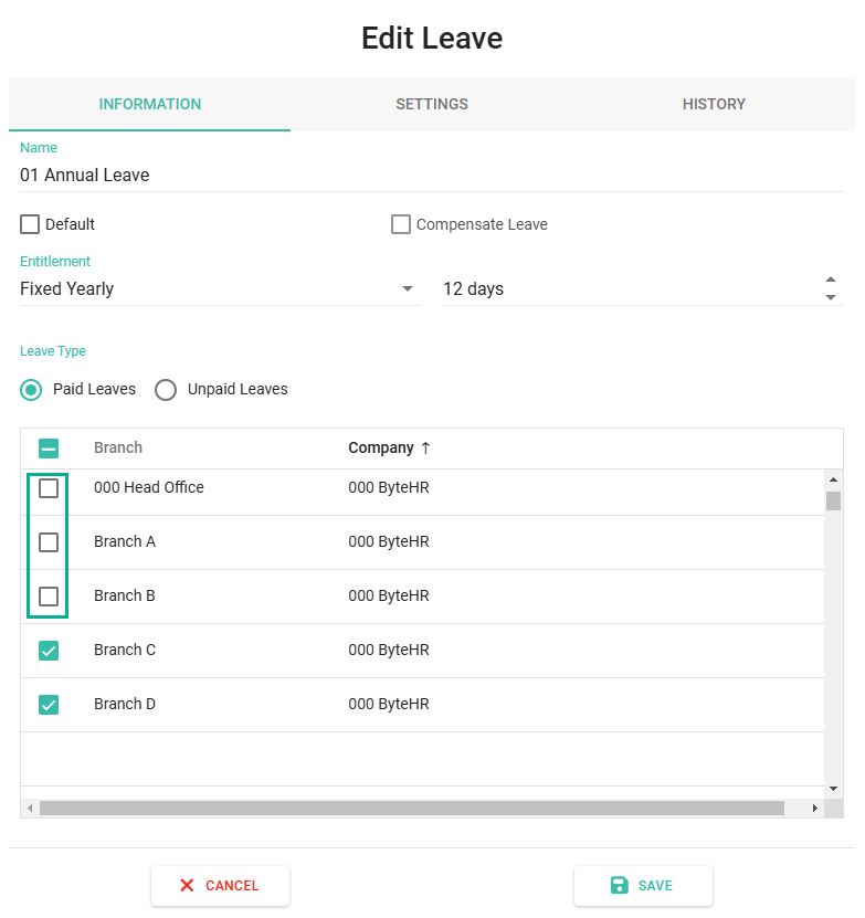 ยกเลิกการใช้ประเภทวันลาทั้งสาขา (Uncheck Branch in Leave Setting)